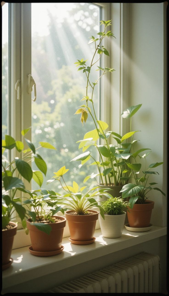 Low-maintenance plants (money plant, snake plant, areca palm)