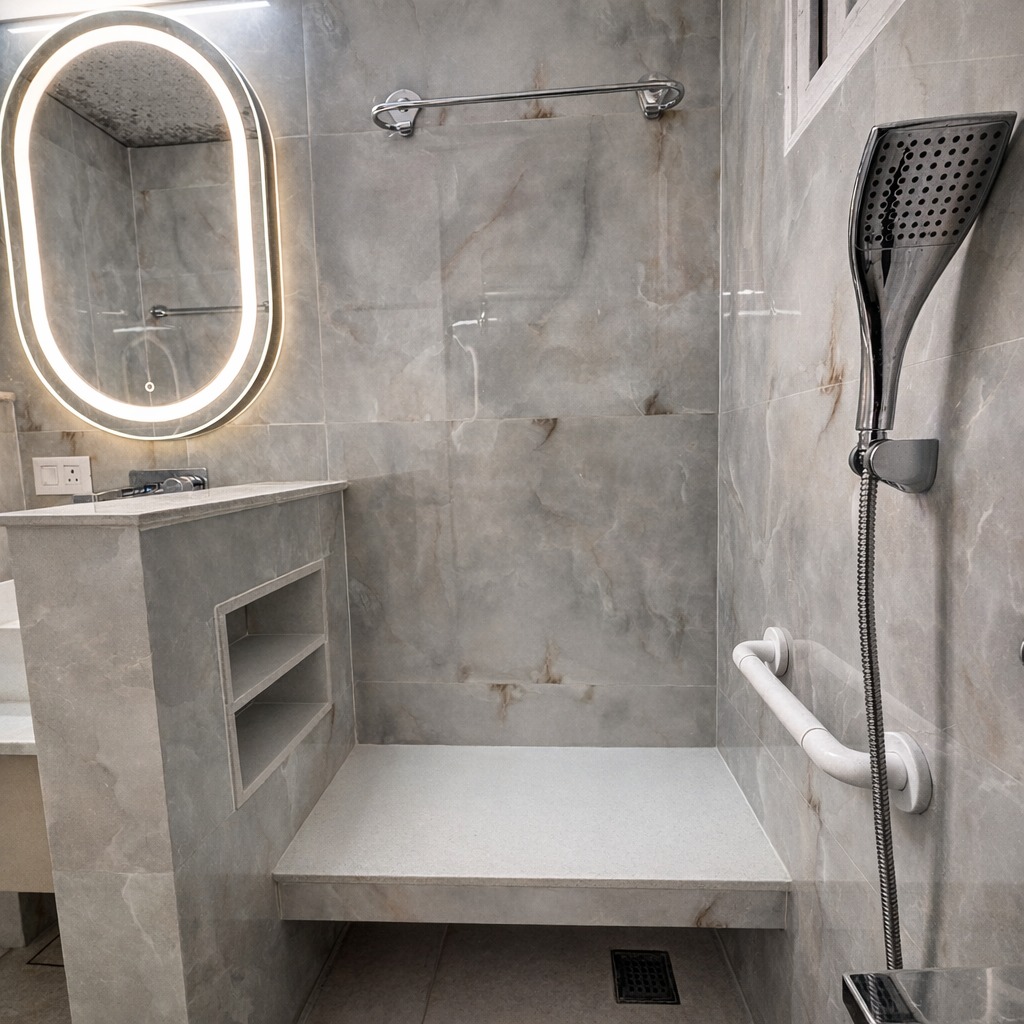 A shower seat or wall-mounted bench allows seniors to bathe safely while seated. A hand shower with adjustable height ensures ease of use without excessive movement.
